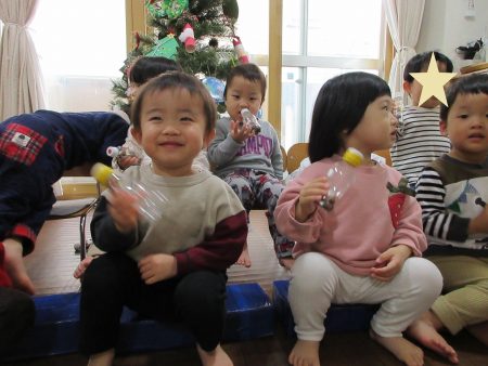 その後は「あわてんぼうのサンタクロースの」歌に合わせて、手作りのマラカスをフリフリ。