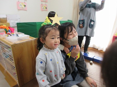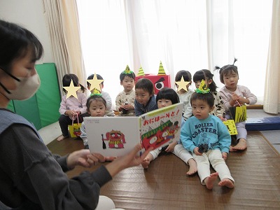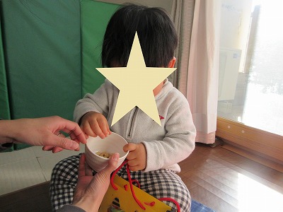 「おにはーそと!」の絵本も読んでもらい「鬼さん来たら、お豆ポイってする!」と意気込む姿も!