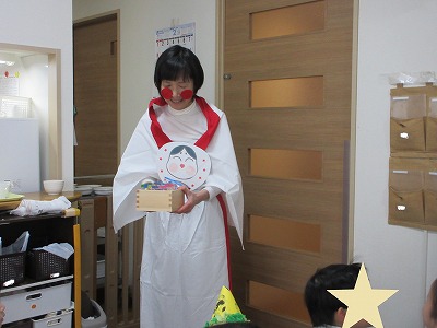 悪い鬼を追い払ってくれたので、みんなが元気に楽しく過ごせますようにという願いを込めて、プレゼントをもらいました!