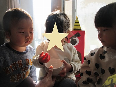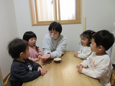 「おにはーそと!」の絵本も読んでもらい「鬼さん来たら、お豆ポイってする!」と意気込む姿も!