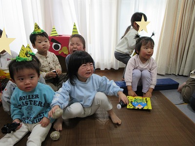 びっくりして泣けてしまう子もいましたが、果敢に豆を投げて立ち向かってくれた子もいました!