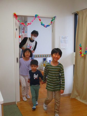 子どもたちと飾りつけや、会の流れの最終確認を行い、「えいえいえお~!」の掛け声の後、いざ!たいよう組さんを迎えに出発です!