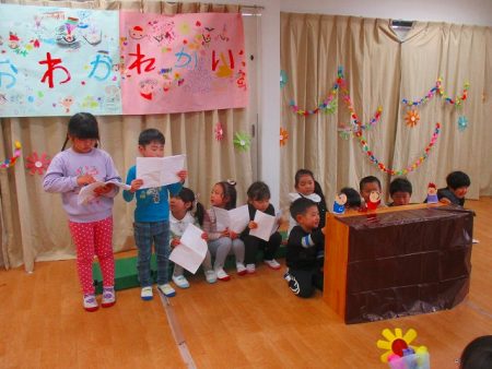 ナレーションの子どもたちは、ペープサートが出ているか見ながら読み始めることを気をつけたり、