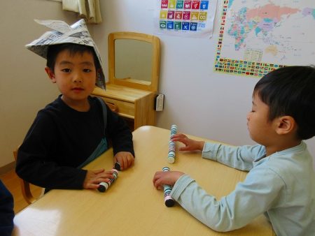 自分の分を折り終えた子は、都合で少し遅めに登園した友だちにも、折り方を教えてくれました!