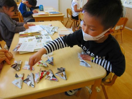まずは新聞紙の形を整えて、その後はさっきもやった通り♪ 折り方を覚えていて自分で進められる子もいました。