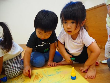 乳児クラスの子どもたちもみんなでお絵描きです。