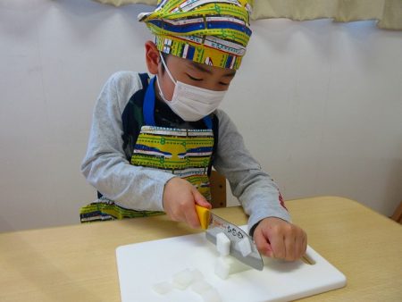 繰り返してクッキングにも取り組んできて、包丁等の器具にも慣れてきた子どもたち。今回もその包丁を使い、いろいろな切り方に挑戦します!