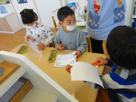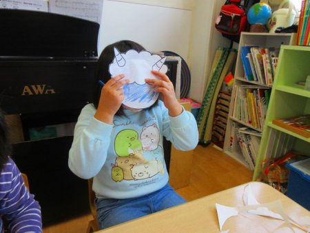 午前中の集会が終わり、給食を食べた後、たいよう組は鬼のお面作りをしました。