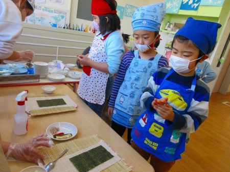 たいよう組とさくら組はおやつに恵方巻クッキングをしました。
