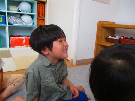 保護者からのメッセージを保育士が代読する間、保育士が読んでいる手紙をじーっと見ていて、読み終えた保育士と目が合うとニコッと頷く姿がありました。