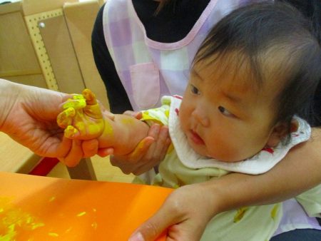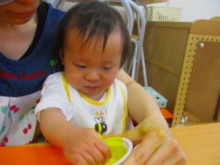 絵の具の感触や手が黄色くなっていることに驚いていたり、