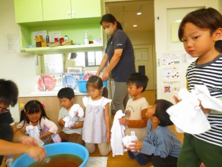 せっけん、水、たらい、初めてみる洗濯板を使います。保育者の話を真剣な表情で聞く子どもたち。
