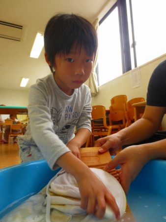保育者の説明を聞いて、「かたくてできない」「むずかしい、、」