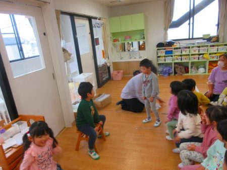 みんなで考えるおたのしみは、「はないちもんめ」。普段から親しんでいるあそびを、リズムに合わせてみんなで楽しみました♪