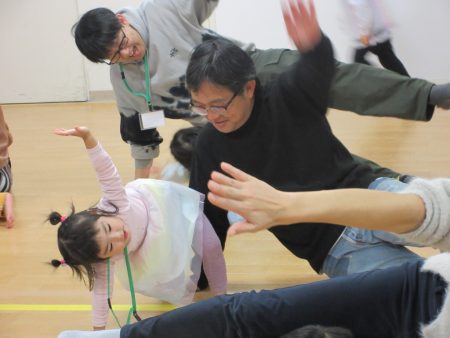大人も普段あまりしない動きでやや苦戦する場面もある中、こどももたちは「できるよ!」とやる気満々で取り組んでいました。