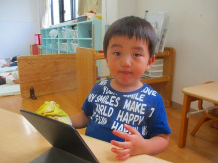 お手伝いした野菜は、給食やおやつの時に出て、「これおてつだいしたやつ?」「おいしそー!」と嬉しそうに食べる姿がありました。