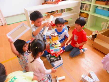 崩れてしまうと「あぁ~!」と残念そうにしながらも「もう一回!」と何度もチャレンジするこどもたち。