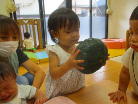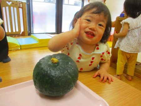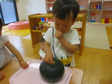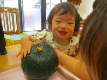 カボチャ丸ごと1つ、目の前に用意すると興味津々で触る子どもたち。