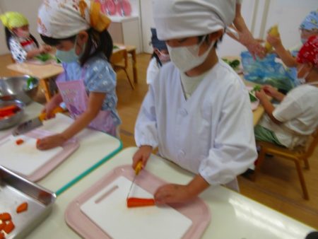 猫の手も上手になり、「にんじん固いね」と言いながらも薄く切れるように丁寧に切っていました。