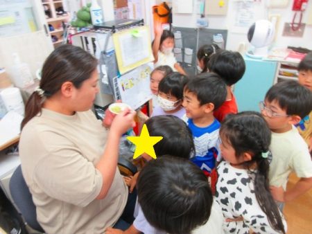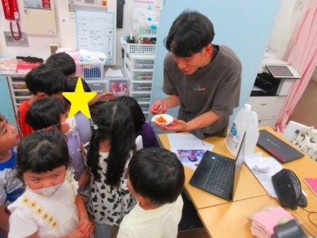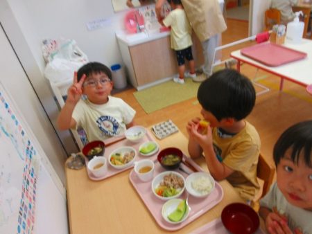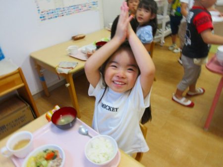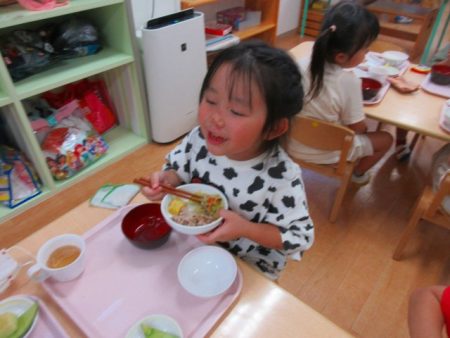 給食では「これ作ったんだよ」とわかば組やたいよう組に教える子ども達でした。