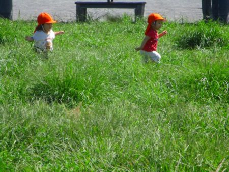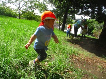 公園では、ひろい原っぱや松林でどんどん歩いていく子どもたち。お友だちと追いかけっこをしたり、草が伸びているところもありますが足をしっかりと上げて分け入っていったり、よろけて膝をついたりその感触も楽しむ姿も見られます。