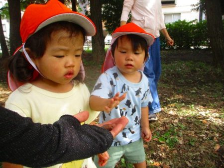 子どもたちは室内でのあそびも楽しんでいましたが、戸外でもいろいろなものを見たり触れたり聞いたり動いたりと五感をフルに使って楽しむ姿が見られます。過ごしやすい時季になってきますので、たくさん戸外でのあそびも楽しんでいきたいと思います♪