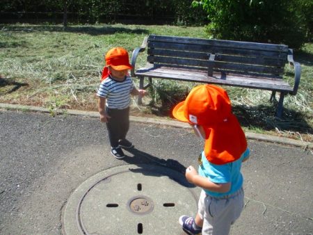 こちらでは、マンホールを発見! この穴なんだろう?と興味津々。