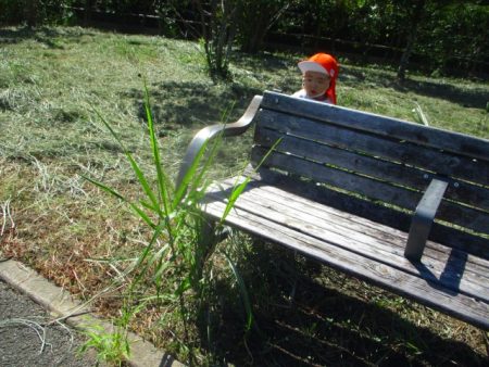 ベンチの裏まで探検…すっごく高い草が生えていて、気になる…。