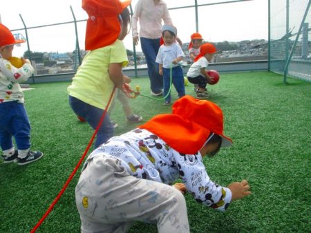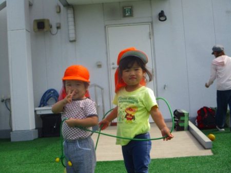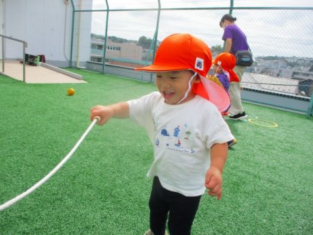 最近の屋上園庭では、ボールや縄跳び、ラバーリングを使って遊んでいます。