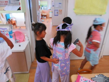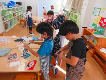 これまで「せんせいてつだってー」だったエプロンの準備も、自分たちで協力し合って取り組む姿に成長を感じます。