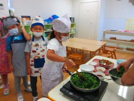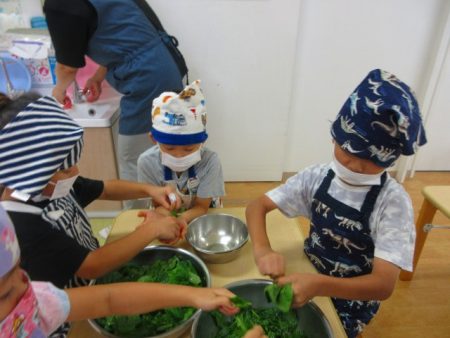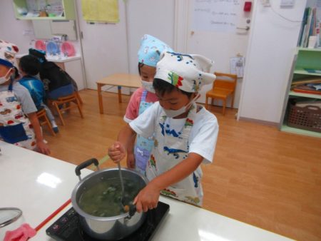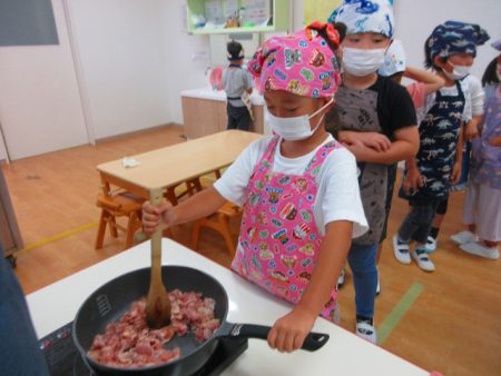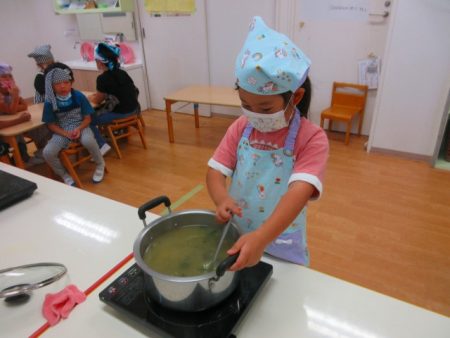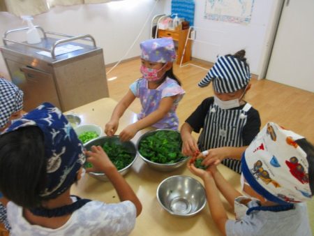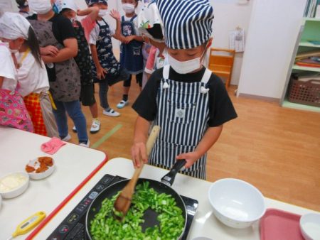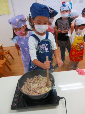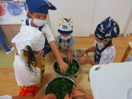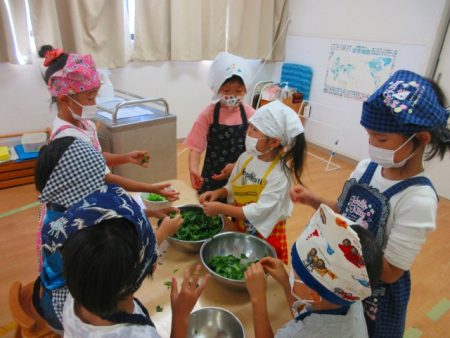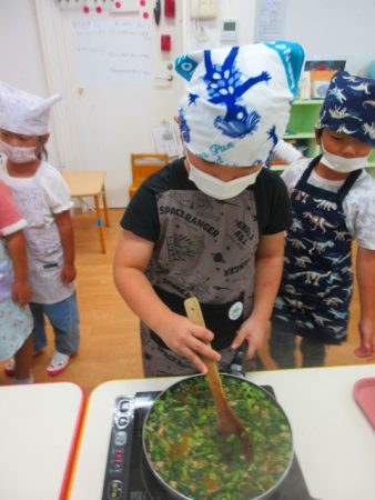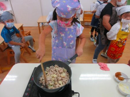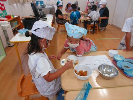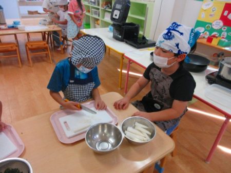 年長になってできることが増え、自信がついてきている子どもたちです。おうちでもぜひ一緒にクッキングしてみてくださいね。