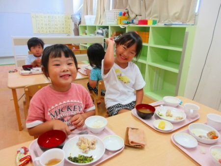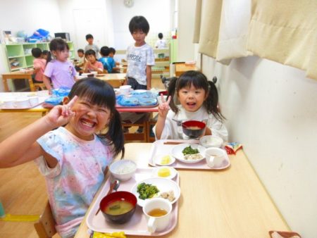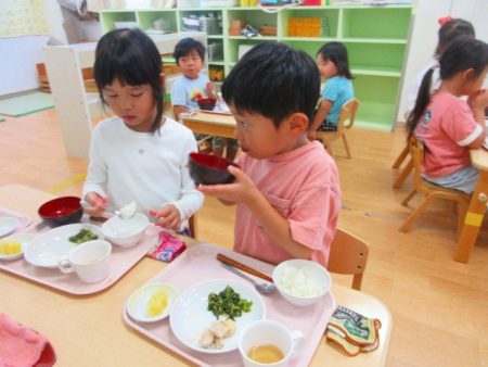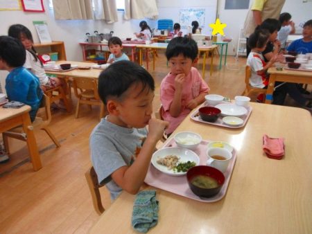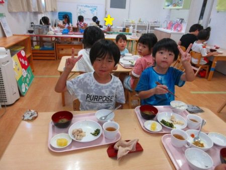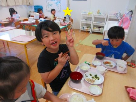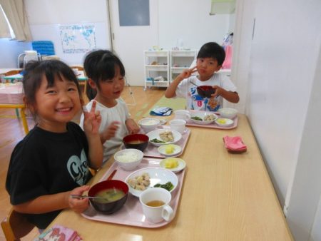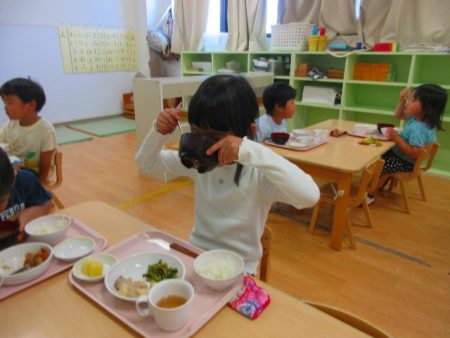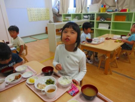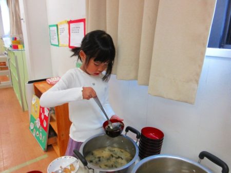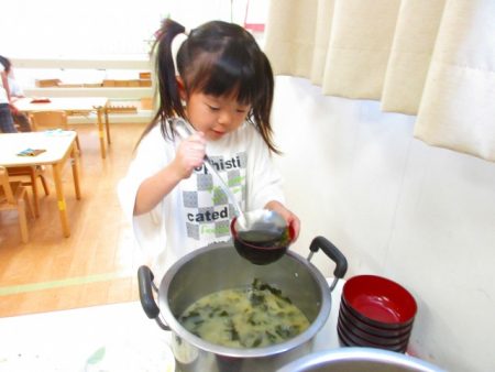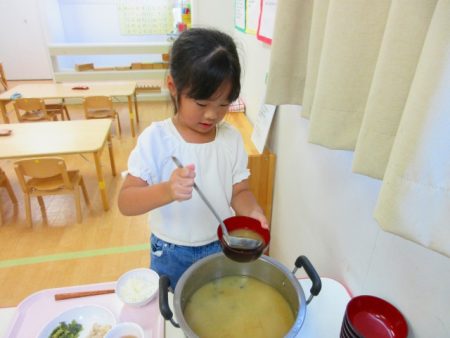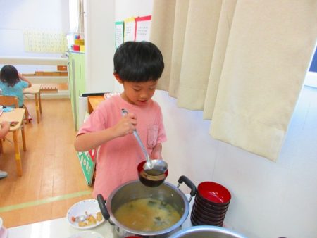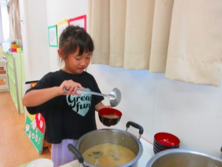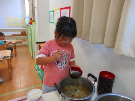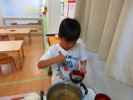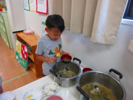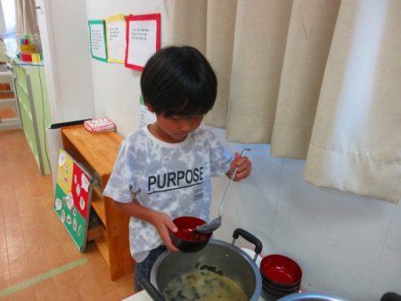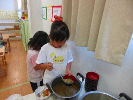 園では初めて配膳を行いましたが、上手によそうことができていました。