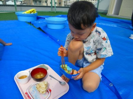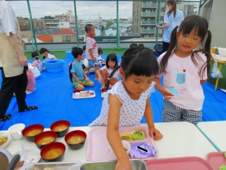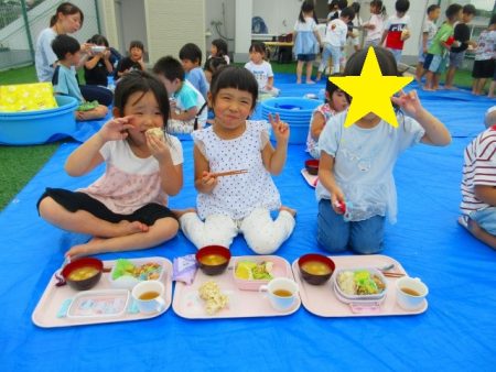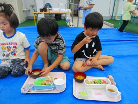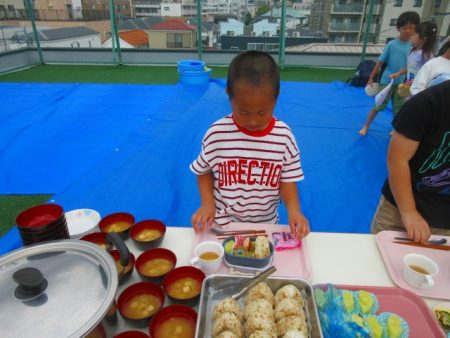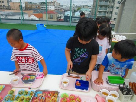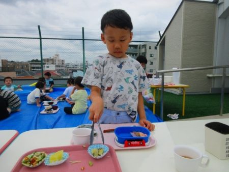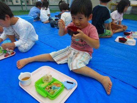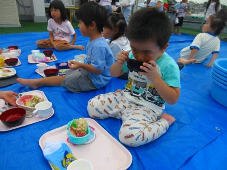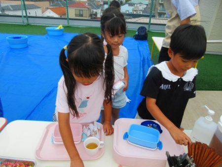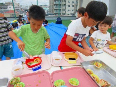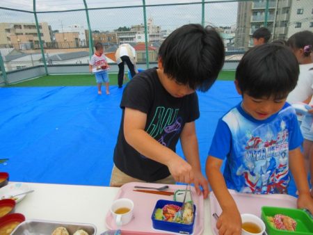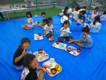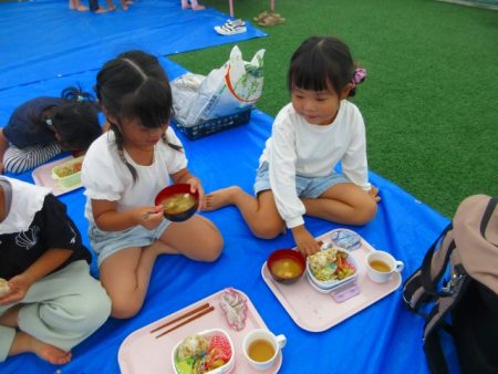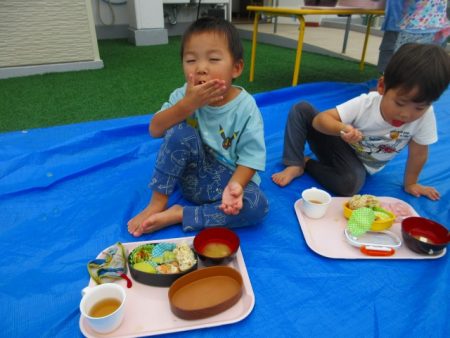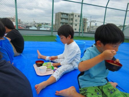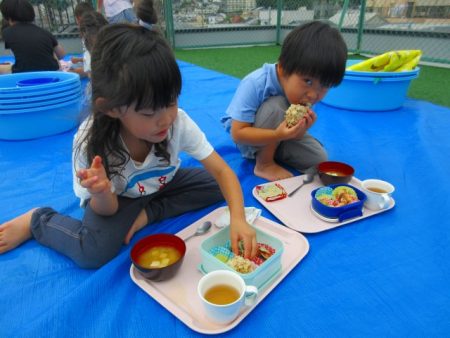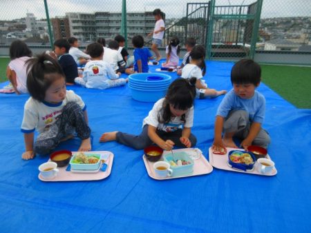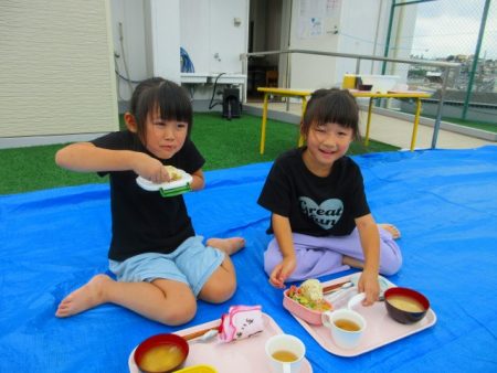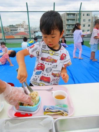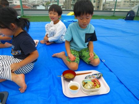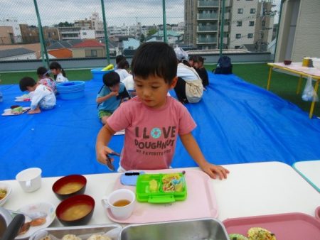 好きなお友だちと好きな場所で、そしていつもと違う屋上で!更に、お弁当箱!という特別感を感じながらの食事の時間はいつもより、より一層美味しく感じていた子どもたち。いつも以上にパクパクと食べていましたよ。
