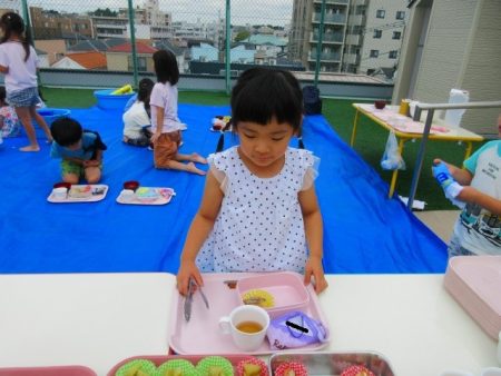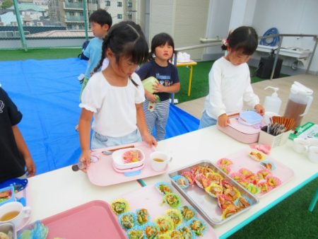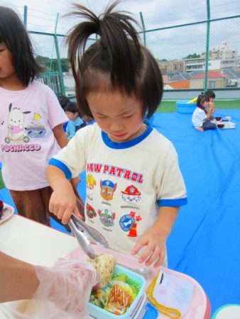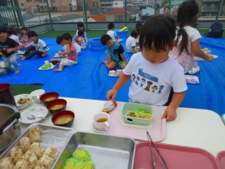 今回は9月のおたのしみランチは『秋の行楽ランチ』でした。幼児クラスは『ピクニックランチ』と題して、屋上園庭でお弁当箱に給食を詰めて食べたので、その様子を紹介します。