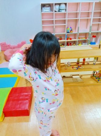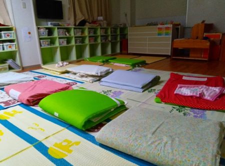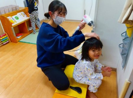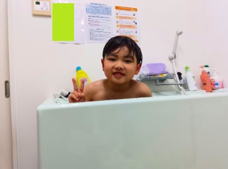 保育園のお風呂は男女でさくらんぼ組とふたば組の沐浴層に分かれて、いざ入浴です。