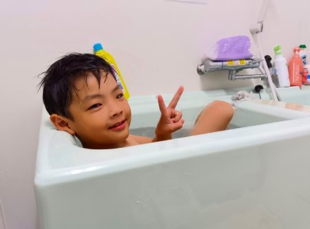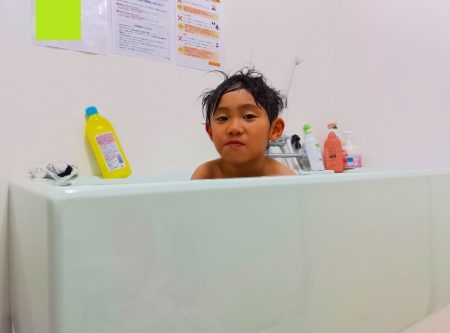 保育園のお風呂は男女でさくらんぼ組とふたば組の沐浴層に分かれて、いざ入浴です。