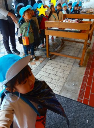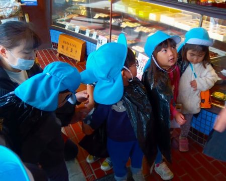 お店の人からお菓子を貰えてうれしそうなこどもたちです!