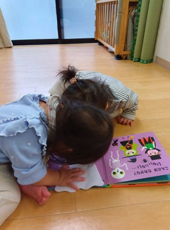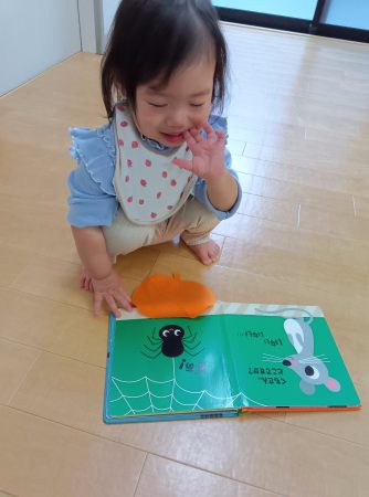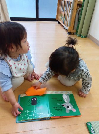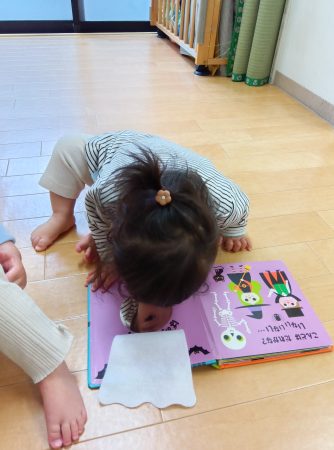 大好きな絵本、『ハロウィンいないいないばぁ』の絵本をお友だちや、保育士と見て、絵本のストーリーに合わせて