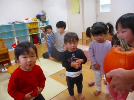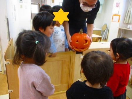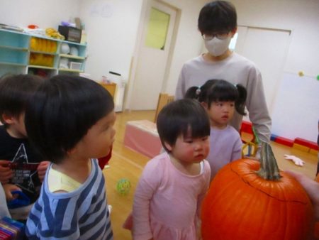 4歳児さくら組のお友だちが、大きなかぼちゃをくりぬいて ジャック・オ・ランタンを作ったよ!と見せてくれました。