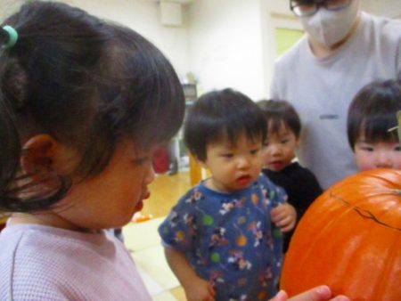 子どもたちは興味津々。絵本でも見ていたビジュアルに、「かぼちゃ!」と沸き立っていましたよ。