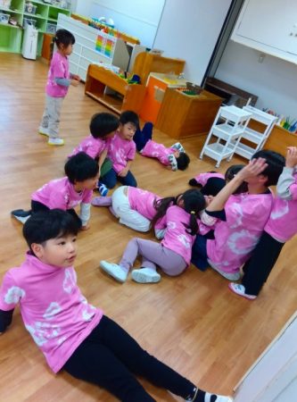 洋服は、前の日にみんなで染めたおそろいのクラスTシャツに着替えます。