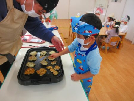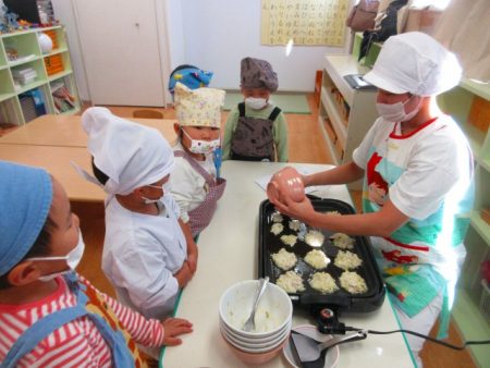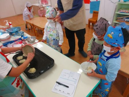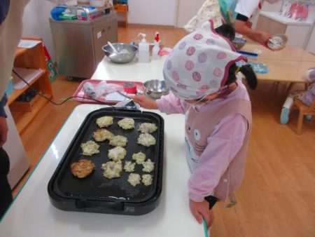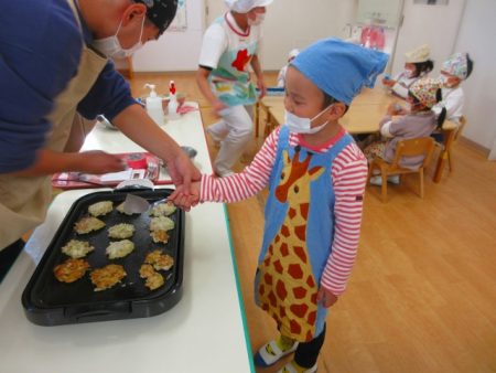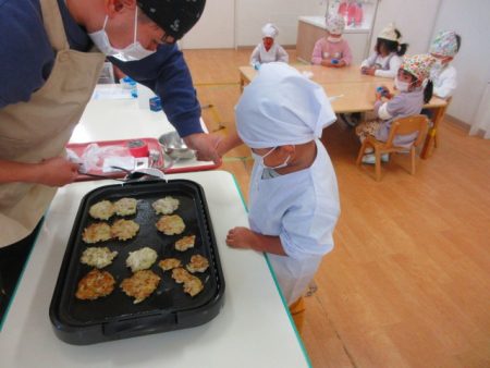 「これ○○のー!」と自分が混ぜた生地がホットプレートに並ぶのをみんなで見ました。