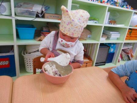 少しずつまとまってきた生地に「できたー?」「もう混ぜれた!」と嬉しそうに混ぜていました。