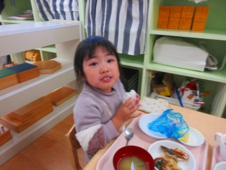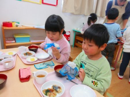 「あけれたー!」「おにぎりおいしい!」とモリモリ食べていました。