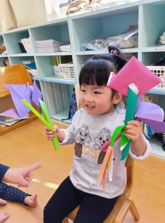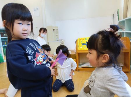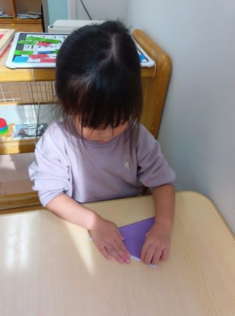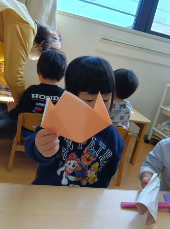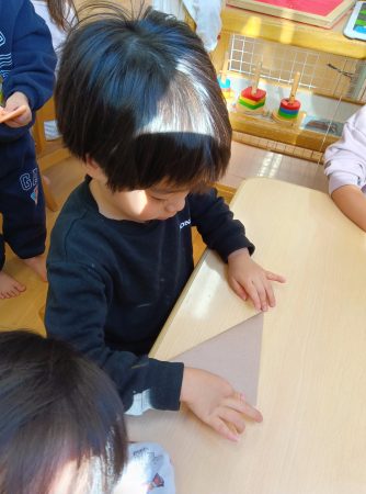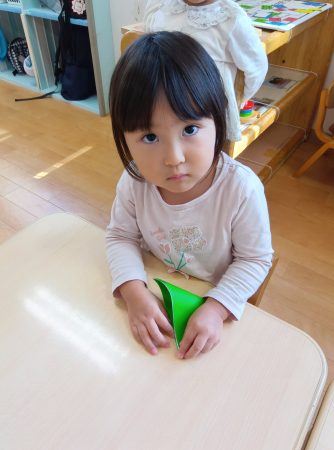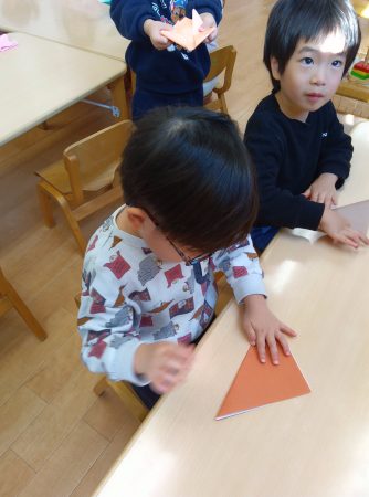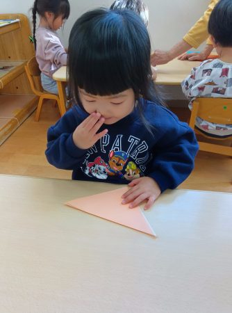「難しい~」と言いながらもきれいな三角を折ろうと角を合わせようと集中する子どもたちでした!