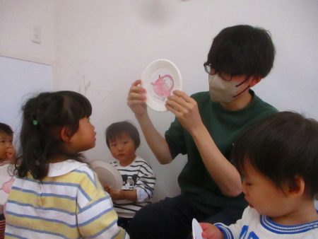 みんなで「だるまさんが」の紙皿シアターで楽しみました。