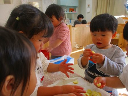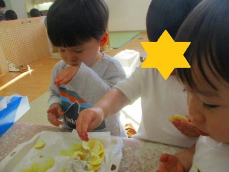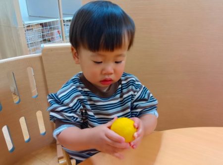 ゆずを用意すると両手で持ってすすんで触る姿が見られ、興味津々な子どもたちでした。