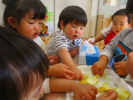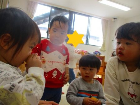 保育者が簡単にお話をして、今日は冬至で、ゆずのお風呂で温まったりカボチャを食べて栄養を付けたりして、寒い冬も元気に過ごせるようにするんだって…と、実際のゆずにも興味津々で触れながら聞いていた子どもたち。