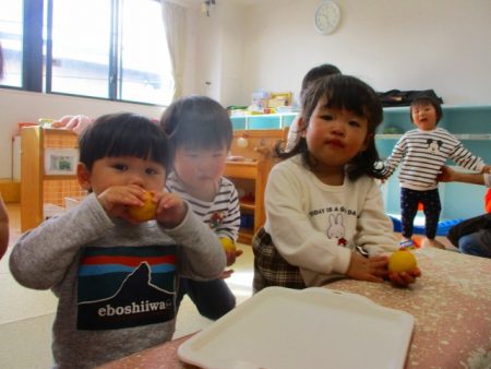 子どもたちも鼻にゆずを近づけて匂いを嗅いでいました( *´艸`)