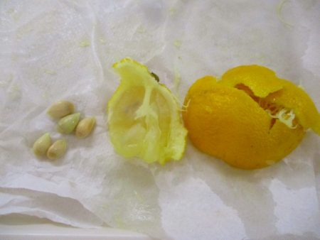 中身はみかんみたい! いいにおいの果汁がいっぱい、タネもたくさん入っているのを、集中して指先で上手に取り出しながら観察していましたよ。